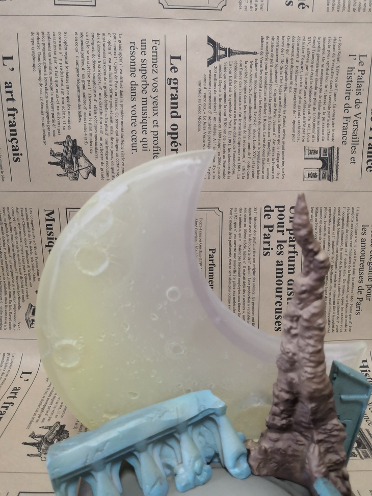 Сам стенд выполнен в виде квадратного камня на котором можно увидеть части: моста, лестниц; сталагмит и Луну. Части лестниц и моста выполнены в серовато-синем тоне. Сталагмит коричневый и высокий. Луна состоит из нескольких частей и сделана из смолы.( минус небольшой в светодиодной ленте внутри луны.) Под луной находится выключатель подсветки.