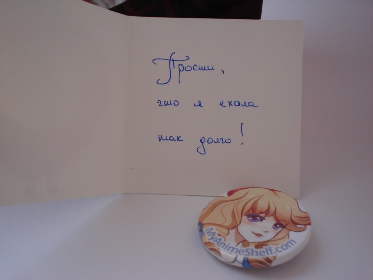 Собственно, содержимое посылки: Аска, значок с Мишель и премиленькая открытка ^__^