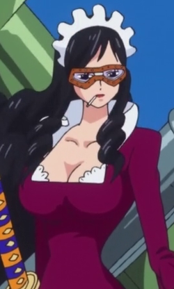 When she arrived at Punk Hazard, she wore goggles around her eyes, which became partially filled with tears after she began to cry. Upon her arrival at Punk Hazard she was seen carrying new weapons on her back: a large flamethrower and a large Gatling gun.
