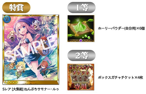 * The possible prizes are one of the following: 'S-Rare Nendoroid Petite Summoner Ruu', 'Holy Powder x6' or 'Box Gacha Ticket x4'.