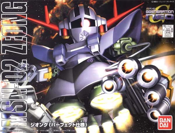 Cute, deformed version of the MSN-02 Zeong. Kit is molded in color (stickers are included for detail areas with differing colors), and features snap-fit assembly. Limited poseability. Stands about 5cm tall when completed. Comes with extending hands, removable head, and leg parts to create the Perfect Zeong, too.