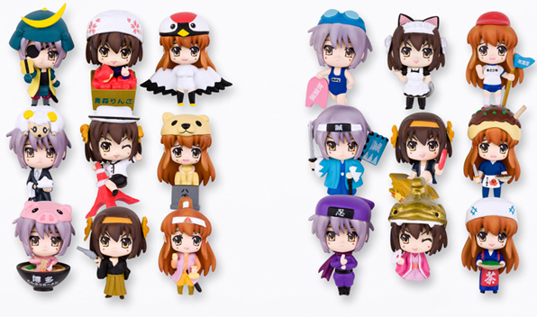 The three heroines from "The Melancholy of Haruhi Suzumiya": Haruhi Suzumiya, Yuki Nagato and Mikuru Asahina were first made into Petit Nendoroids, and now they're also being made into tiny mascots!
