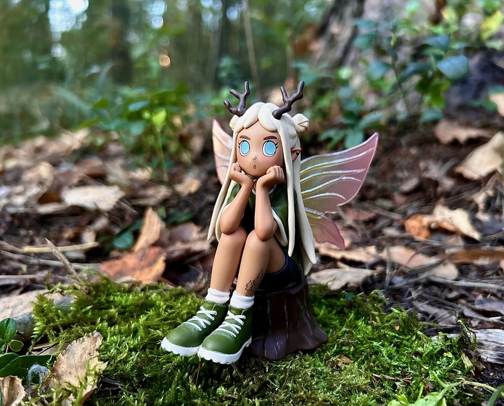 Выгуляла в лесу феечек Peach Riot от pop mart и Цири)